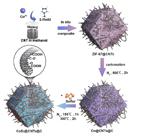 圖 1. CoS2@CNTs@C復合材料局部碳化和硫化示意圖。