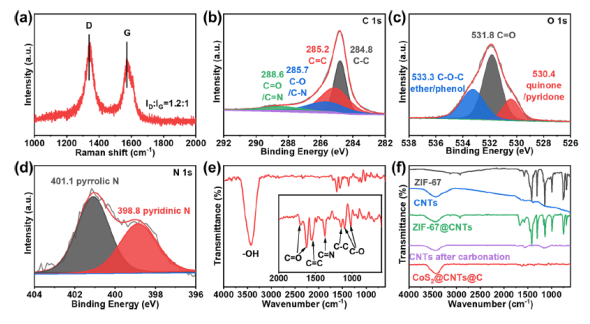 圖 3. (a)拉曼光譜,(b) C 1s, (C) O 1s, (d) N 1s XPS光譜,(e) CoS2@CNTs@C的FTIR光譜,(f) FTIR對比結果。