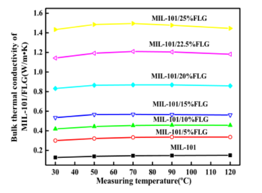 Figure 4. 測量溫度對MIL-101和MIL-101/FLG復合材料熱導率的影響。