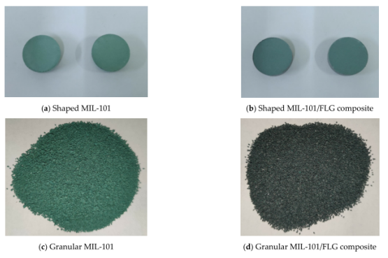 Figure 1. 成型和顆粒狀 MIL-101 和 MIL-101/FLG復合材料的外部形態。(a) 成型MIL-101。(b) 成型 MIL-101/FLG 復合材料。(c) 顆粒狀 MIL-101。(d) 顆粒狀 MIL-101/FLG 復合材料。
