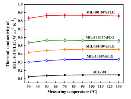 Figure 3. MIL-101/FLG 復合材料和 MIL-101 在不同測量溫度下的熱導率。