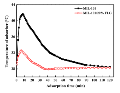 Figure 4. MIL-101/20%FLG 和 MIL-101 吸附劑在吸附過程的溫度特性曲線。