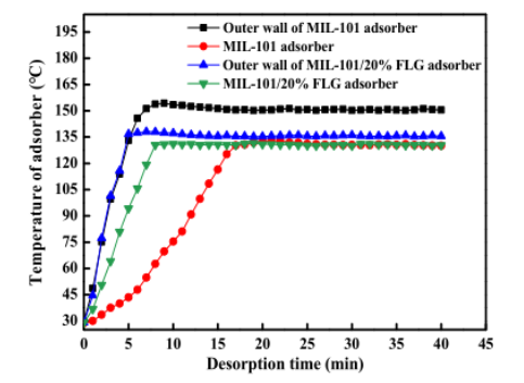 Figure 5. MIL-101/20%FLG和MIL-101吸附劑在熱脫附過程中外壁和內壁之間的溫度變化。