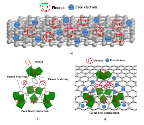 Figure 6. (a) FLG, (b) MIL-101和(c) MIL-101/FLG 復合材料的結構及導熱機理示意圖。