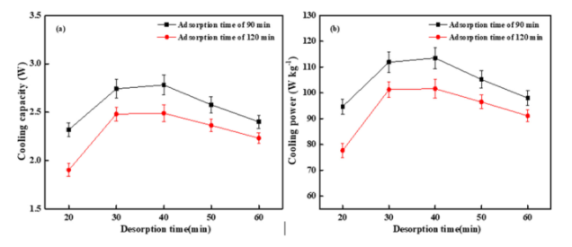 Figure 8. MIL-101/20%FLG-水工作對在不同解吸時間下的冷卻能力(a)和冷卻功率(b)。