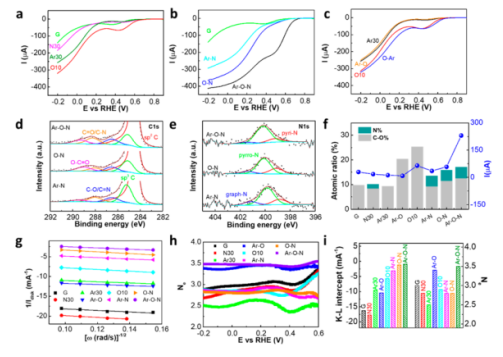 Figure 3. ORR活性與G@GC中化學成分的相關性。(a-c) 不同樣品在相應條件下的LSV 曲線對比。(d-e) C1s 和 N 1s XPS 光譜。(f) 0.4 V下 ORR 活性與碳-氧和碳-氮的原子百分比的相關性。(g) K-L圖。(h) 電子轉移數。(i) K-L截距。