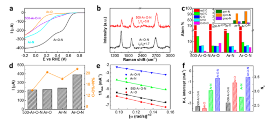 Figure 4. 空位缺陷、氧和氮摻雜劑在ORR中的具體作用。(a) LSV 曲線。(b) Ar-O-N和500-Ar-O-N的拉曼光譜。(c) 原子百分比。(d) ORR 活性與碳-氧原子百分比和碳-氮原子百分比的相關性。(e) K-L 圖。(f) K-L截距。