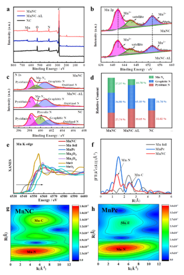 圖 3.(a)MnNC、MnNC-AL和NC催化劑的XPS測量光譜。(b)MnNC和MnNC-AL的高分辨率Mn 2p 光譜。(c) 高分辨率N 1s光譜。(d) MnNC、MnNC-AL和NC 的 Mn-Nx、石墨N和吡啶N的擬合相對含量。(e) MnNC、Mn箔、MnPc、Mn2O3、Mn3O4、MnO和MnO2的Mn K-edge XANES。(f) MnNC 和MnPc的R空間傅立葉變換 EXAFS 擬合曲線。(g)MnNC和(h)MnPc的小波變換 (WT) EXAFS 圖。