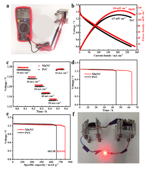 -2電流密度下的典型恒電流放電曲線。(e)MnNC和Pt/C基ZAB的電壓-容量曲線。(f)由兩個串聯的ZAB供電的紅色LED的照片。