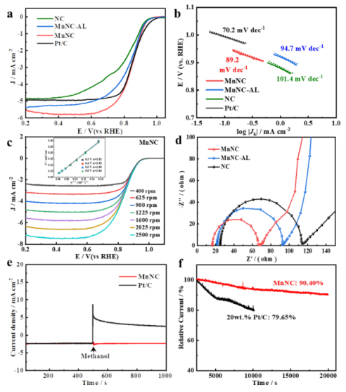 圖 4.(a)LSV曲線和(b)MnNC、MnNC-AL和NC催化劑與Pt/C相比的Tafel斜率。(c) MnNC在400到2500rpm不同速度下的LSV曲線。插圖,相應的K-L圖和不同電位下的電子轉移數 (n)。(d) MnNC、MnNC-AL和NC催化劑的奈奎斯特圖。(e)MnNC和Pt/C催化劑在O