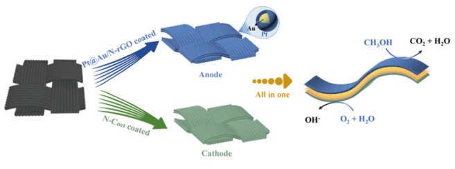 可穿戴自供電傳感器是最近柔性電子設備的一個有前途的前沿領域。 在這項工作中,已經制造了一種可穿戴燃料電池(FC)型自供電運動智能傳感器,特別是首次選擇甲醇蒸汽作為目標燃料。Pt@Au/N-rGO 的核殼結構和多孔碳網絡作為甲醇氧化和氧還原反應催化劑,高導電堿性水凝膠作為固態電解質。 因此,用于自供電傳感系統的可穿戴 FC 對 2-20% (v/v) 甲醇蒸汽表現出優異的傳感性能,最大功率密度為 2.26 μW cm