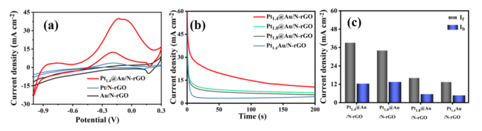 1.4Au/N-rGO和-0.05 V下的Ptm@Au/N-rGO催化劑。(c)從CV曲線總結的Ibof Pt