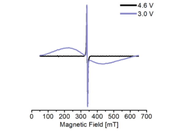 (紫線)后的X波段EPR光譜。光譜中心的尖峰對應于復合材料中的導電碳,而放電時觀察到的寬線形被指定為NMC811。
