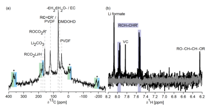 下分解。MAS 頻率 = 28 kHz。 星號表示旋轉邊帶。(b) NMC811/Li 電池在 NMR管電池中的原位溶液