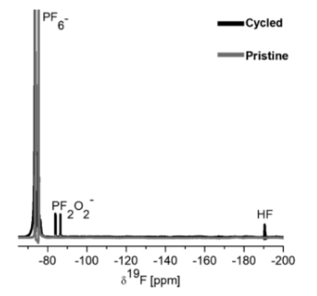 H NMR,在 C/10 在 3.0 和 4.6 V(黑色)之間進行 10 次恒電流循環后,與原始電解質(灰色)的 NMR 譜重疊。