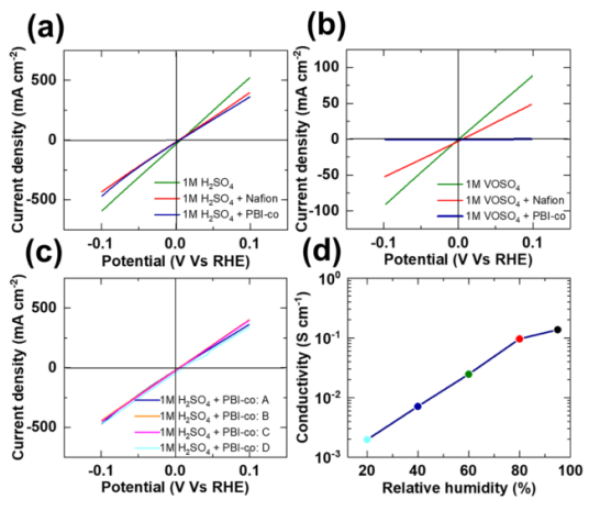 圖4.用于質(zhì)子和氧釩離子通過 Nafion和功能化PBI-co膜的電驅(qū)動四點(diǎn)探針電池中的電流-電位 (I-V)曲線(a)1 M H