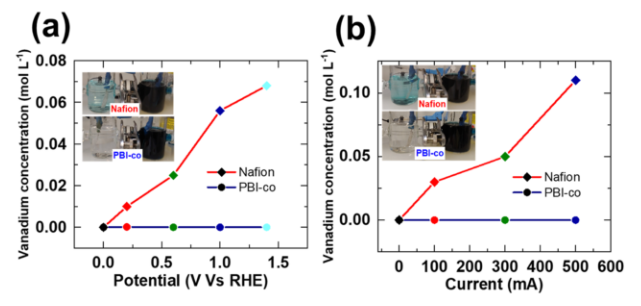 圖 5. 圖 4. Nafion 和功能化 PBI-co 膜的空白半電池中釩離子濃度的紫外-可見分光光度分析:(a) 釩離子濃度與外加電位圖和 (b) 釩離子濃度與外加電流圖 .圖 (a)中的插圖是施加 1.4 V 電壓 1 小時后電池的照片,顯示在Nafion中交叉,但在功能化 PBI-co 膜中顯示零交叉; 圖 (b)中的插圖是施加 500 mA 電流1小時后電池的照片,顯示Nafion 膜中的交叉,但功能化 PBI-co 中的交叉為零。