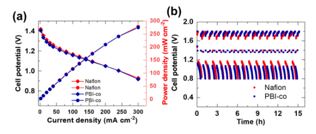 圖 7. (a)單電池釩-RFB 中功能化PBI-co和Nafion膜的放電極化曲線和相關(guān)功率密度曲線。 極化曲線是使用電池的HFR進(jìn)行iR校正的。電解質(zhì)是4.0 M H