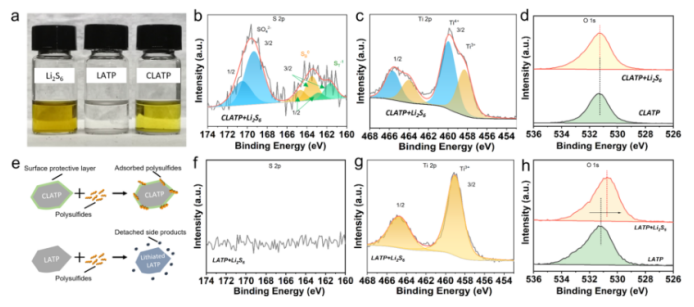 圖 2. (a) LATP 和 CLATP 的視覺吸附測試。(b) S 2p, (c) Ti 2p, 和 (d) 多硫化物吸附后 CLATP 的 O 1s XPS 光譜。(e) CLATP和LATP的多硫化物吸附機制示意圖。多硫化物吸附后LATP的 (f) S 2p、(g) Ti 2p 和 (h) O 1s XPS 光譜。