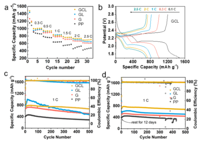圖 4. (a)使用PP隔膜的Li-S紐扣電池在沒有和有G、GL和GCL的情況下的倍率性能。(b) 帶有 GCL 改性 PP 隔膜的 Li-S 紐扣電池的充放電電壓曲線。(c)使用裸PP隔膜的Li-S電池和1C下具有G、GL和GCL的Li-S電池的循環性能。(d)休息12天后Li-S電池的循環性能。