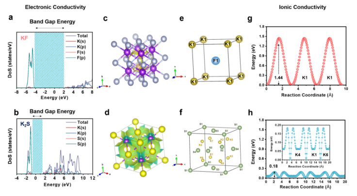 2S結(jié)構(gòu)內(nèi)的離子擴(kuò)散路徑和相應(yīng)的K位點(diǎn)。基于鍵價能量景觀計算的 (g)KF和(h) K