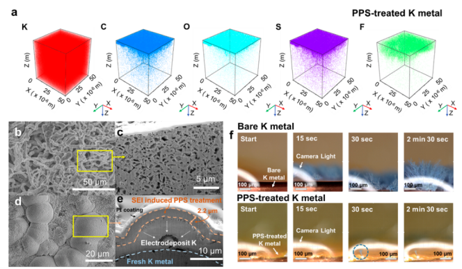 2S化合物的電子和離子導(dǎo)電固體電解質(zhì)中間相層的形成,從而實(shí)現(xiàn)了無枝晶形態(tài)的致密K鍍層。與裸K金屬陽極相比,PPS處理的K金屬陽極在實(shí)際限制下使用TiS