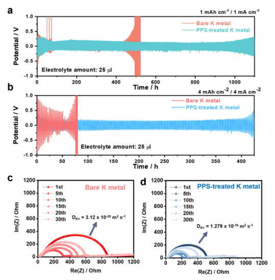 −2的情況下,具有(c)裸露和(d)PPS處理的K金屬陽極的對稱電池的交流阻抗譜超過30次循環(huán)。
