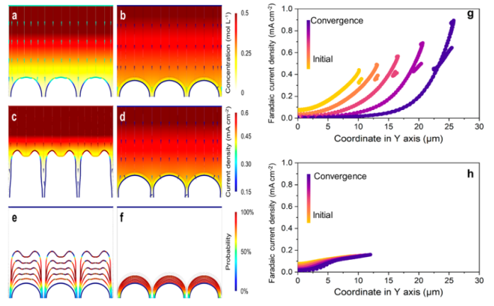 圖 4.(a)裸露和(b)PPS處理的K金屬陽極表面附近的初始濃度和電場。收斂狀態(tài)下(c)裸露和(d)PPS處理的K金屬陽極表面附近的濃度和電場。陽極表面的形態(tài)演變與K在電沉積過程中(e)裸 K 和(f)PPS 處理 K 表面電沉積的可能性。電沉積期間(g)裸K和(h)PPS處理的K金屬陽極表面法拉第電流密度沿y軸的分布。