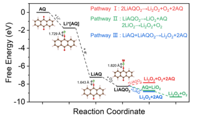 圖 5. AQ 催化溶液介導(dǎo)的 ORR 在 298.15 K 時(shí)在 0.1 M LiClO4-CH3CN 電解質(zhì)溶液中的反應(yīng)自由能分布。插圖是可能的 AQ 催化溶液介導(dǎo)的 ORR 途徑的示意圖。