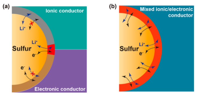 圖 1.(a)傳統(tǒng)三相界面和(b)混合離子/電子導(dǎo)電雙相界面處的電荷轉(zhuǎn)移行為圖示。