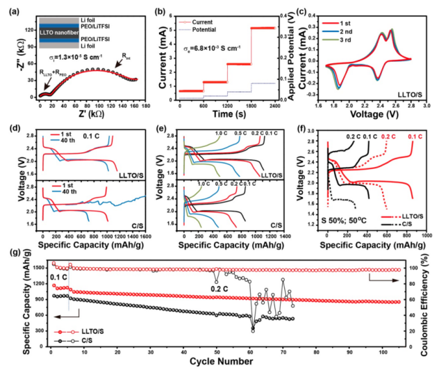 圖 3. (a) LLTO/C 納米纖維的奈奎斯特圖,具有用于離子電導(dǎo)率測(cè)定的電子阻擋配置(插圖)。(b) SS|LLTO/C|SS 配置在步進(jìn)電位下的計(jì)時(shí)電流法結(jié)果,用于確定電子電導(dǎo)率。(c) LLTO/S ASSLSB 在 0.2 mV/s 時(shí)的 CV 曲線。(d) LLTO/S 和 C/S 在 0.1 C 下的恒電流充放電曲線。 (e) LLTO/S 和 C/S 在不同電流速率下的充放電曲線。(f) LLTO/S 和 C/S 在較低溫度 (50 °C)下具有較高硫含量(50%)的充放電曲線。(g)LLTO/S和C/SASSSLSB 的循環(huán)穩(wěn)定性。