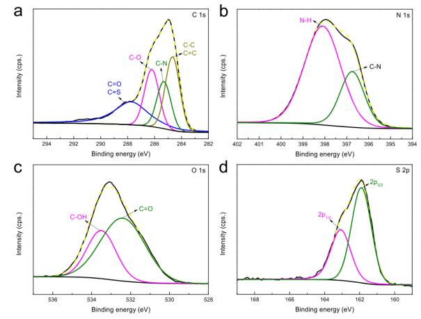 圖 3. PQTU的XPS光譜:(a) C 1s、(b) N 1s、(c) O 1s 和 (d) S 2p。