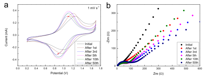 圖 5. (a) CV 曲線和(b) PQTU∥ZnSO4∥Zn 電池在不同放電/充電循環(huán)后的 Nyquist 圖。