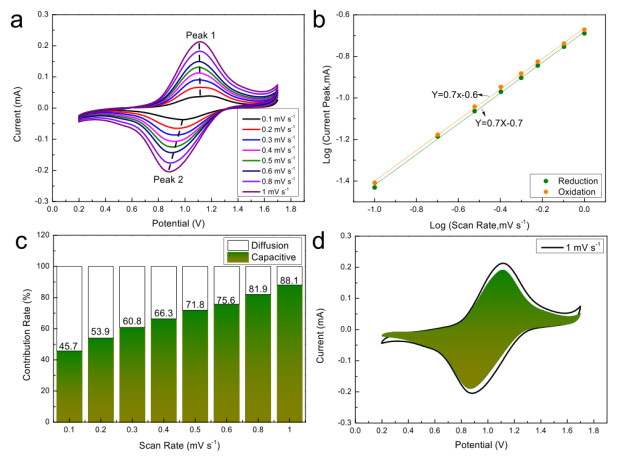 −1時(shí)的電容和擴(kuò)散控制電流貢獻(xiàn)。