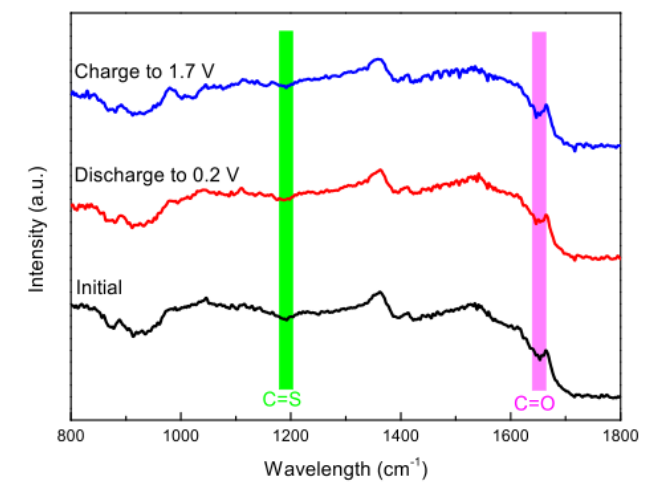 2+的配位并提高了比容量。 非原位FT-IR還支持醌羰基的氧化還原和硫脲基團(tuán)與Zn