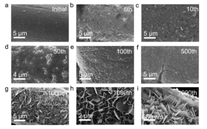圖9. PQTU 陰極(a)在初始狀態(tài)和 (b)5th、(c)10th、(d)50th、(e)100th、(f)500th 和(g-i) 之后的非原位 SEM 圖像在 0.1 A g