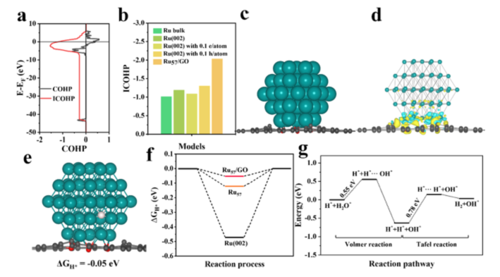 57/GO的最佳氫吸附構(gòu)型及其對應(yīng)的ΔGH*。(f)計(jì)算出Ru(002)、Ru