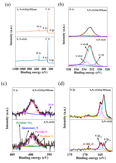 圖3. (a) S,N-rGO和S,N-rGO@MXene的XPS測量光譜和S,N-rGO和S,N-rGO@MXene的(b)O 1s、(c)N 1s和(d) S 2p高分辨率XPS光譜。