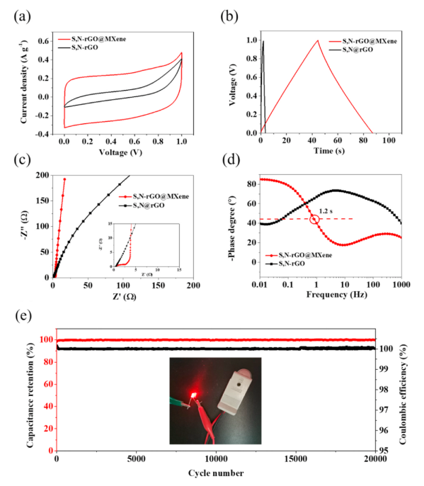 −1時的GCD曲線,(c) Nyquist曲線和高頻區放大圖,(d)基于S,N-rGO@MXene和S,N-rGO的對稱超級電容器的Bode曲線,(e)S,N-rGO@MXene超級電容器20,000次循環后的電容保持率和庫侖效率。