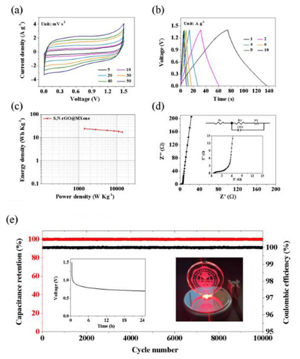 圖5. 基于S,N-rGO@MXene的對稱全固態超級電容器的電化學性能評估。(a)不同掃描速率時的CV曲線,(b)不同電流密度時的GCD曲線,(c) Ragone圖,(d) Nyquist圖,高頻區域和擬合電路模型放大圖(插圖),(e)10000次循環后的電容保持率和庫侖效率,自放電曲線和四個全固態超級電容器串聯的LED照明設備的圖片 (插圖)。