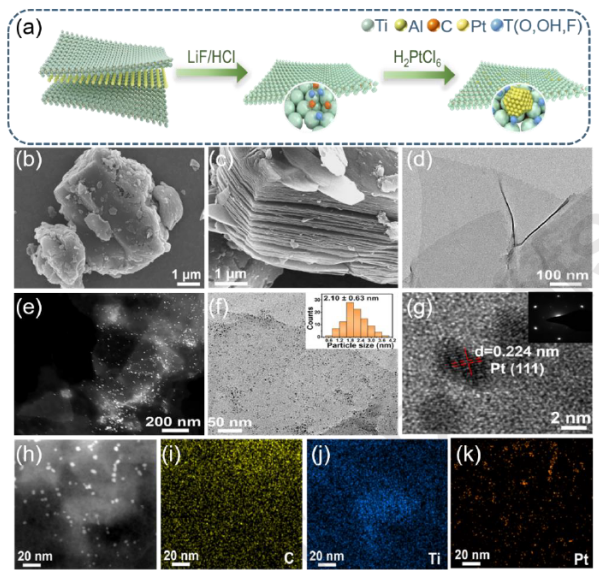 x MXene的透射電鏡(TEM)圖像;(e) 1% Pt@MXene的高角度環(huán)形暗場掃描透射電子顯微鏡圖像;(f) 1% Pt@MXene的TEM圖像, (g) 1%的高分辨率透射電子顯微鏡(HRTEM)圖像Pt@MXene (h) 1% Pt@MXene的HAADF STEM圖像及其對應的能量色散x射線光譜(EDS)映射圖像(i) C;Ti (j);(k) Pt原子。