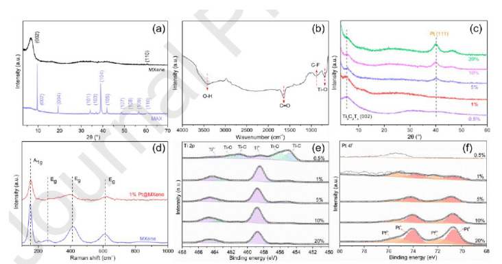 圖2 (a) MAX和MXene的XRD譜圖;(b) MXene的紅外光譜;(c) Pt@MXene樣品的XRD譜圖。(d) MXene和1% Pt@MXene的拉曼光譜;Pt@MXene樣品中(e) Ti2p和(f) Pt 4f的XPS光譜。