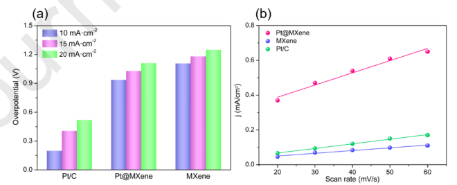 圖4。 (a)過電位,(b) MXene、Pt/C和1% Pt@MXene的電流密度與掃描速率的關系圖。