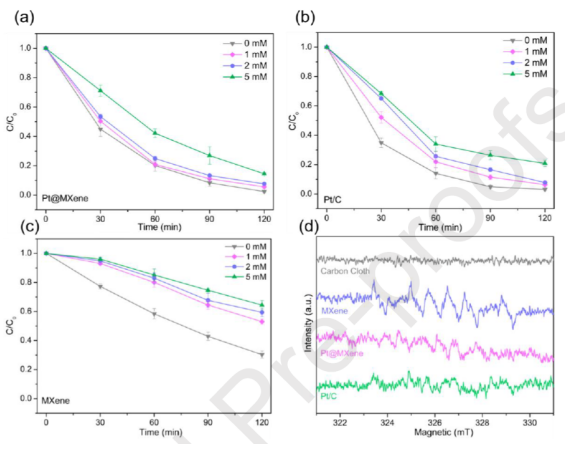 圖5。不同t-BuOH濃度下CAP在(a) 1% Pt@MXene、(b) Pt/C、(C) MXene上的降解;(d)樣品的DMPO自旋俘獲ESR光譜。