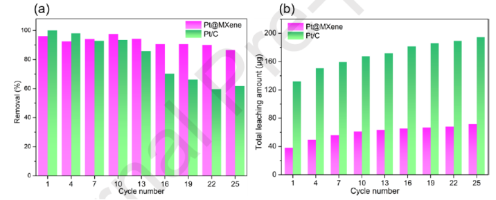 圖7 (a) Pt/C和1% Pt@MXene對CAP降解的可重復使用性;(b)在1% Pt@MXene和Pt/C條件下,25次穩(wěn)定性試驗循環(huán)的總浸出量。