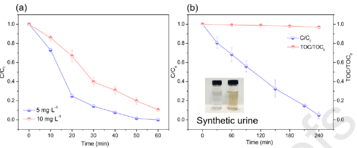 圖8。(a)不同濃度的CAP在1% Pt@MXene上的降解,(b) TOC的演化和CAP在合成尿介質中的降解,圖中:電還原前和電還原后的合成尿。