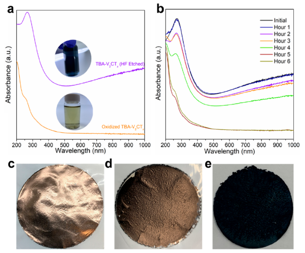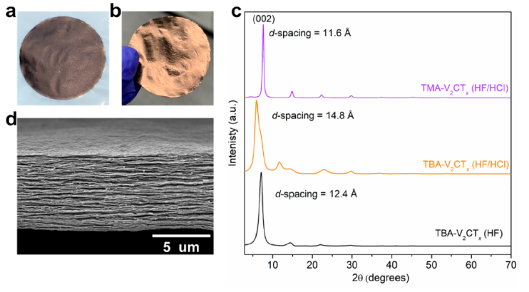 MXene型碳化釩,特別是V2CTx型碳化釩,在從能量存儲、傳感到電子和光學等諸多領域都有應用前景。然而,在過去的十年中,由于分層的V2CTx在膠體狀態下的不穩定性,有關V2CTx的研究大多局限于其多層形態。在本文中,報道了溫和的合成條件,從而得到高質量的V2CTx和離子交換過程,將MXene在水懸浮液中的保質期增加了大約3個數量級,從幾個小時到幾個月。討論了蝕刻和分層機制,并為研究人員提供了一個指導方針與MXene組成。解釋了蝕刻劑配方、分層化學品和后處理對合成的V2CTx的質量、化學穩定性和光電性能的影響。在離子交換和絮凝過程中,四丁基銨和四甲基銨離子被鋰離子取代。分層后的V2CTx產生的沉淀物不僅可以懸置幾個月而不降解,還可以重新分散并加工成薄膜。這些MXene薄膜在光學和電子性能上有明顯的改善。它們在干燥狀態下的電導率可以超過1000 S cm-1,這是之前V2CTx無法達到的值。在本工作中,V2CTx的貨架壽命和性能的主要改進,有望使這種MXene的性能的基礎研究,并大大擴大其潛在的應用范圍。建議的方法可能適用于其他需要使用季胺進行分層的MXenes。