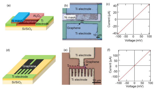 圖1. 在其中一個石墨烯/電極界面上形成Ni掩膜的石墨烯基光電探測器的(a)原理圖、(b)光學(xué)顯微鏡圖像、(c)電流-電壓特性曲線。梳狀電極的石墨烯基光電探測器的(d)原理圖、(e)光學(xué)顯微鏡圖像、(f)電流-電壓特性曲線。
