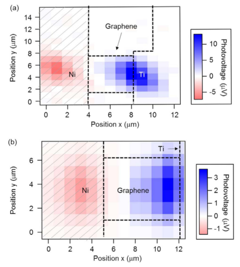石墨烯是開發(fā)高速、寬波長范圍光電探測器的理想材料。但是,由于石墨烯兩端兩個電極的每一個石墨烯/電極界面上的光電壓極性相反,它們在宏觀光照射到光電探測器時被抵消了。在本研究中,我們提出了兩種基于石墨烯的光電探測器,它們具有不同的非對稱器件結(jié)構(gòu),可以抑制兩電極界面上的光電壓抵消。其中一種光電探測器有一個局部蔭罩,只有石墨烯/電極界面的一側(cè)被金屬蔭罩遮蔽。另一種具有不同形狀的電極,通過使用梳狀電極,石墨烯/電極界面的接觸面積不同。通過掃描石墨烯光電探測器周圍的聚焦光,我們測量了光探測的位置依賴性,由于兩個光電探測器的非對稱結(jié)構(gòu),可以得到不對稱的光電電壓映射。此外,我們還證明了通過抑制光電壓抵消,光電探測器在可見光、近紅外光和中紅外光區(qū)域的宏觀光探測。這些非對稱結(jié)構(gòu)的石墨烯基光電探測器適用于可見光、近紅外光和中紅外光區(qū)域?qū)挷ǘ蔚暮暧^光電探測器。