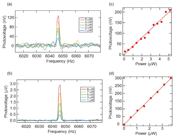圖5. 在不同的激光功率下,用光譜分析儀測量了宏觀(a)可見光(690 nm)和(b)NIR光(1530 nm)光輻照下,Ni掩模石墨烯光探測器的調(diào)制光探測(6049 Hz)。用Ni掩模石墨烯光電探測器在211 Hz時的鎖相放大器測量的 (c)可見光(690 nm)和(d) NIR(1530 nm)的光電壓光強相關(guān)性。紅色的線顯示線性擬合的結(jié)果。